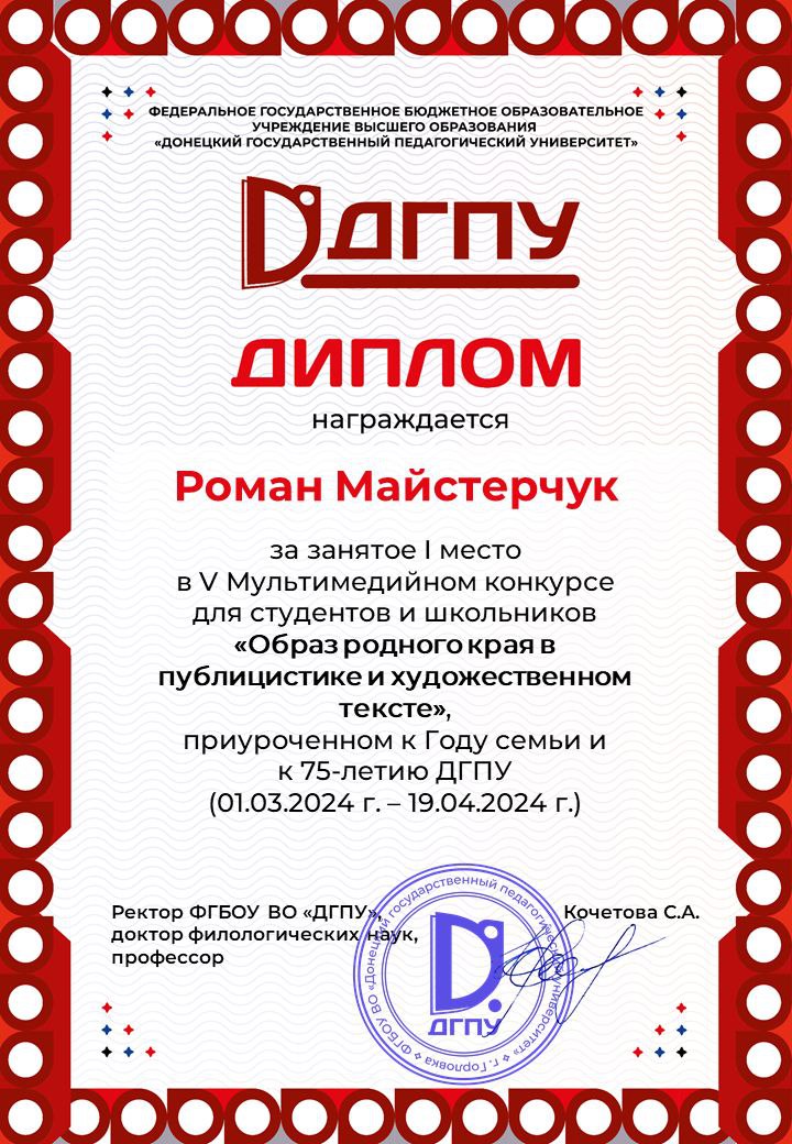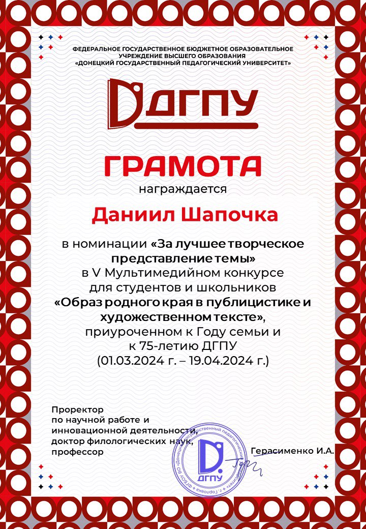С 1 марта по 19 апреля 2024 года в ФГБОУ ВО «Донецкий государственный педагогический университет» проходил V Мультимедийный конкурс для студентов и школьников «Образ родного края в публицистике и художественном тексте».