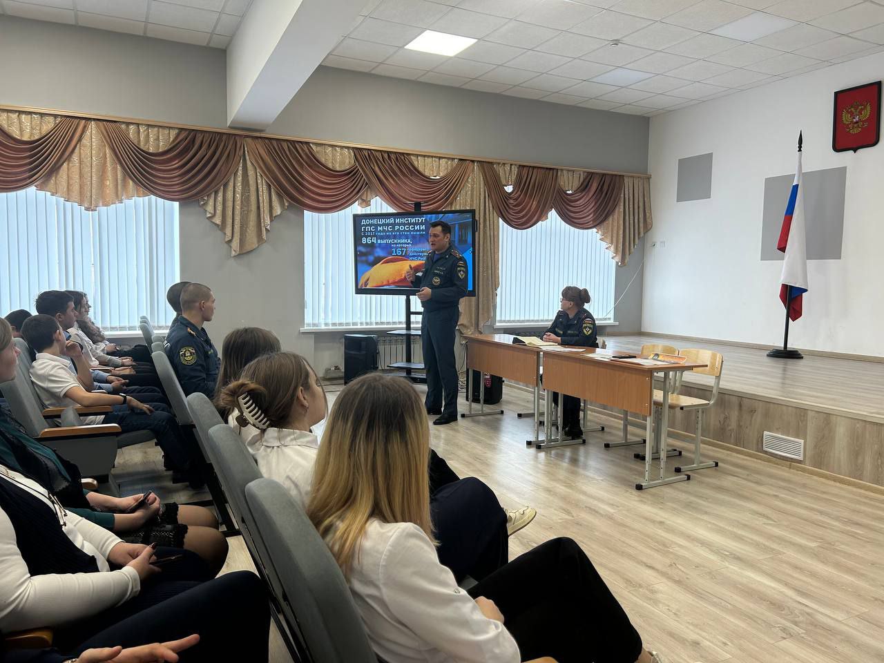 Представителем Донецкого института выступил полковник внутренней службы Живов Андрей Алексеевич. Будущим абитуриентам представилась возможность узнать об основных экзаменах, которые потребуются для поступления и о том, что сотрудник «чрезвычайного» ведомства должен обладать не только профессиональными качествами, позволяющими выполнять поставленные задачи в срок, но и иметь высокие личностно-психологические характеристики. Школьники узнали о порядке приема в Донецкий институт, требованиях для поступления и условиях несения службы.