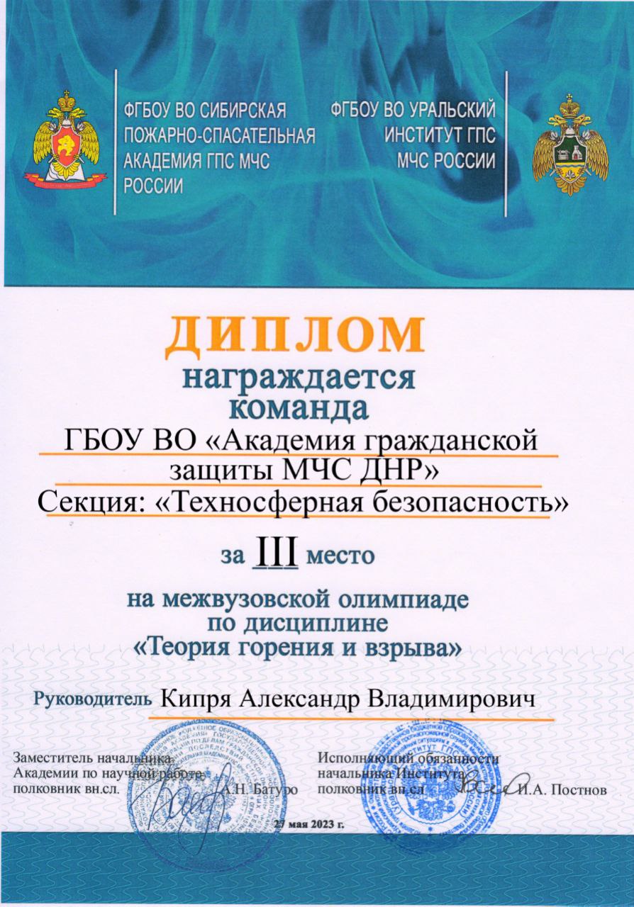 27 мая 2023 года обучающиеся ГБОУ ВО «АГЗ МЧС ДНР» приняли участие в                Межвузовской онлайн олимпиаде выходного дня по дисциплине «Теория горения и взрыва». Организатором данного мероприятия выступила кафедра химии и процессов горения ФГБОУ ВО «Сибирская пожарно-спасательная академия ГПС МЧС России» совместно с кафедрой химии и процессов горения ФГБОУ ВО «Уральский институт ГПС МЧС России».