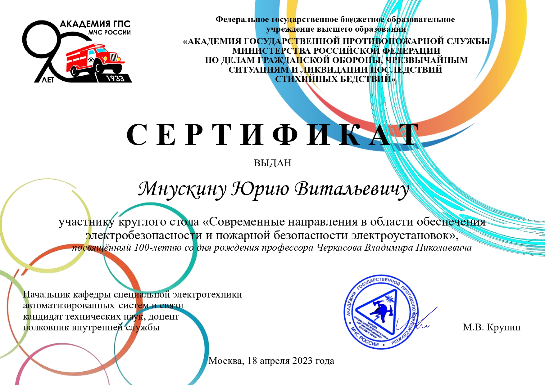 18 апреля 2023 года кафедрой специальной электротехники, автоматизированных систем и связи Академии ГПС МЧС России была организована работа Межвузовского круглого стола «Современные направления в области обеспечения электробезопасности и пожарной безопасности электроустановок», посвященного 100-летию со дня рождения профессора Владимира Николаевича Черкасова.