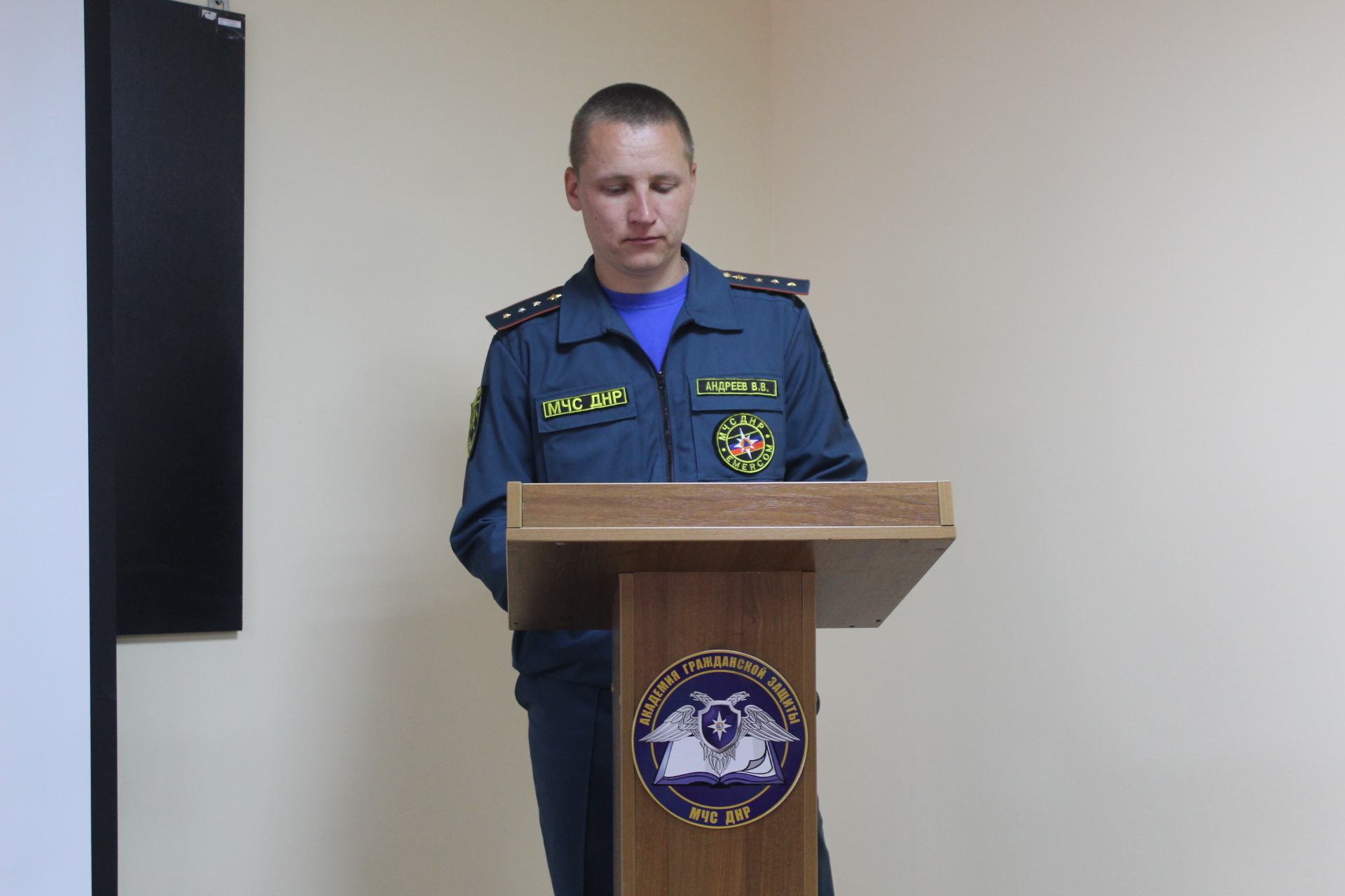 Председатель Государственной аттестационной комиссии – директор Департамента гражданской обороны и защиты населения МЧС ДНР полковник службы гражданской защиты Капустин Вадим Борисович поздравил студентов выпускного курса с началом защит выпускных квалификационных работ и пожелал отличных результатов.
