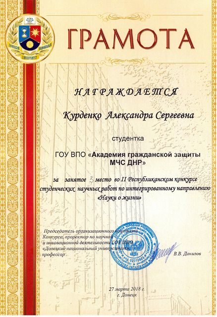 Руководство Академии поздравляет КУРДЕНКО Александру Сергеевну с занятым III местом во II Республиканском конкурсе студенческих научных работ по интегрированному направлению «Науки о жизни» и желает Александре дальнейших творческих успехов!