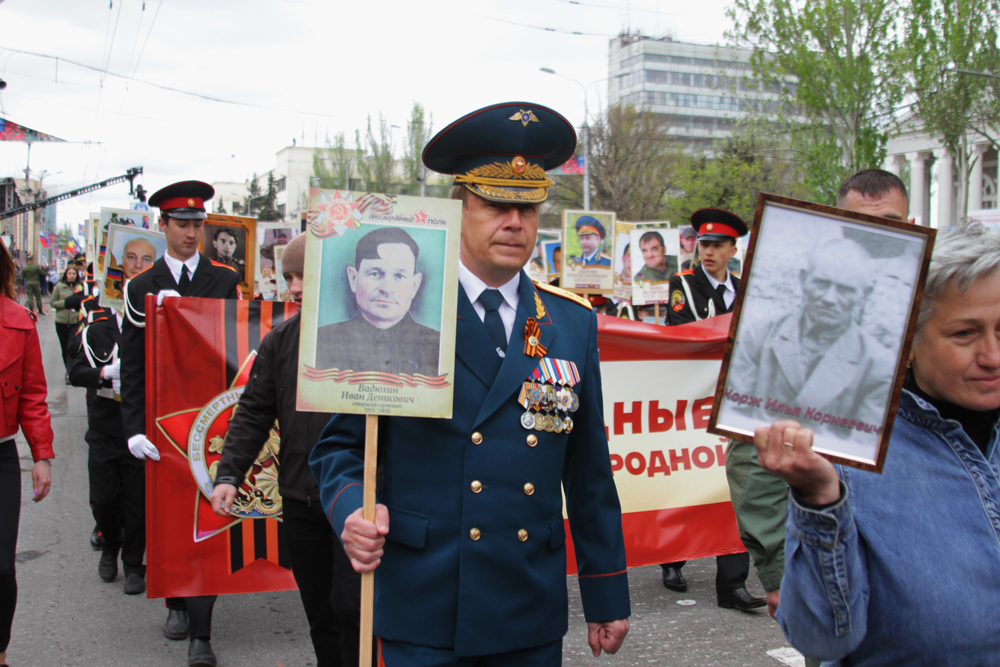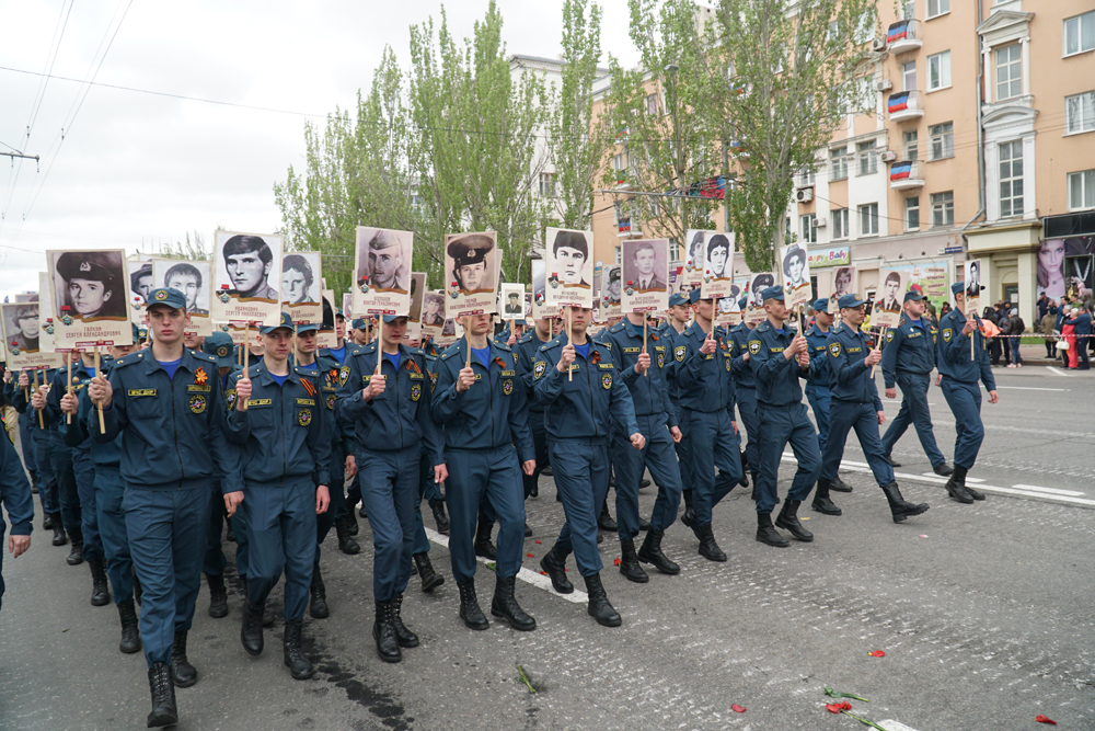 Вслед за военным парадом по главной улице Донецка прошли участники памятной акции «Бессмертный полк», в которой принял участие Министр МЧС генерал-лейтенант службы гражданской защиты Кострубицкий Алексей Александрович. В памятном шествии также участвовали сотрудники спасательного ведомства, курсанты и студенты Академии гражданской защиты МЧС.