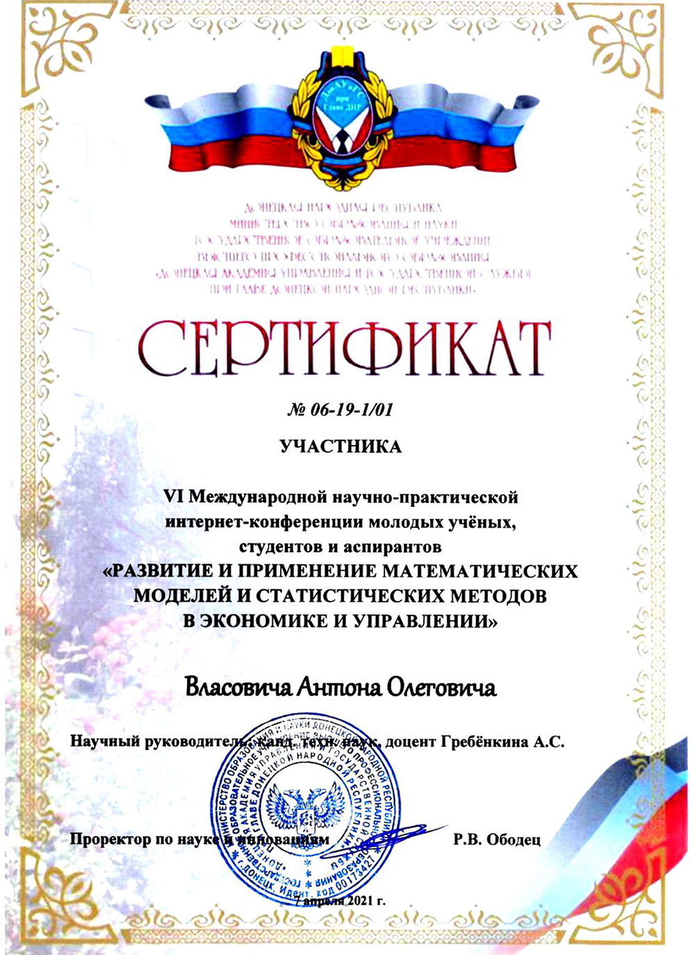 7 апреля 2021 года на базе ГОУ ВПО «Донецкая Академия управления и государственной службы при Главе Донецкой Народной Республики», ГО ВПО «Донецкий национальный университет экономики и торговли им. Михаила Туган-Барановского» и Батумского Государственного Университета имени Шота Руставели состоялась VI Международная научно-практическая интернет-конференция молодых ученых, студентов и аспирантов «Развитие и применение математических моделей и статистических методов в экономике и управлении».