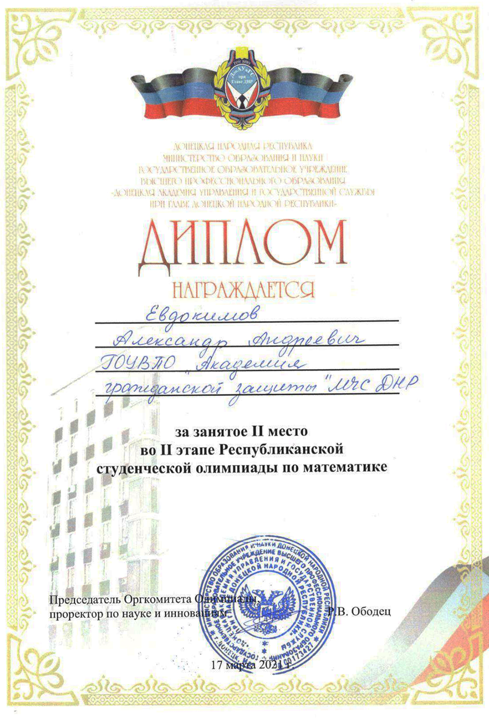 17 марта 2021 г. на базе ГОУ ВПО «Донецкая академия управления и государственной службы при Главе Донецкой Народной Республики» состоялся II этап Республиканской студенческой олимпиады по математике. Целью проведения олимпиады являлось выявление и развитие способностей к математике, а также стимулирования математического творчества студентов.