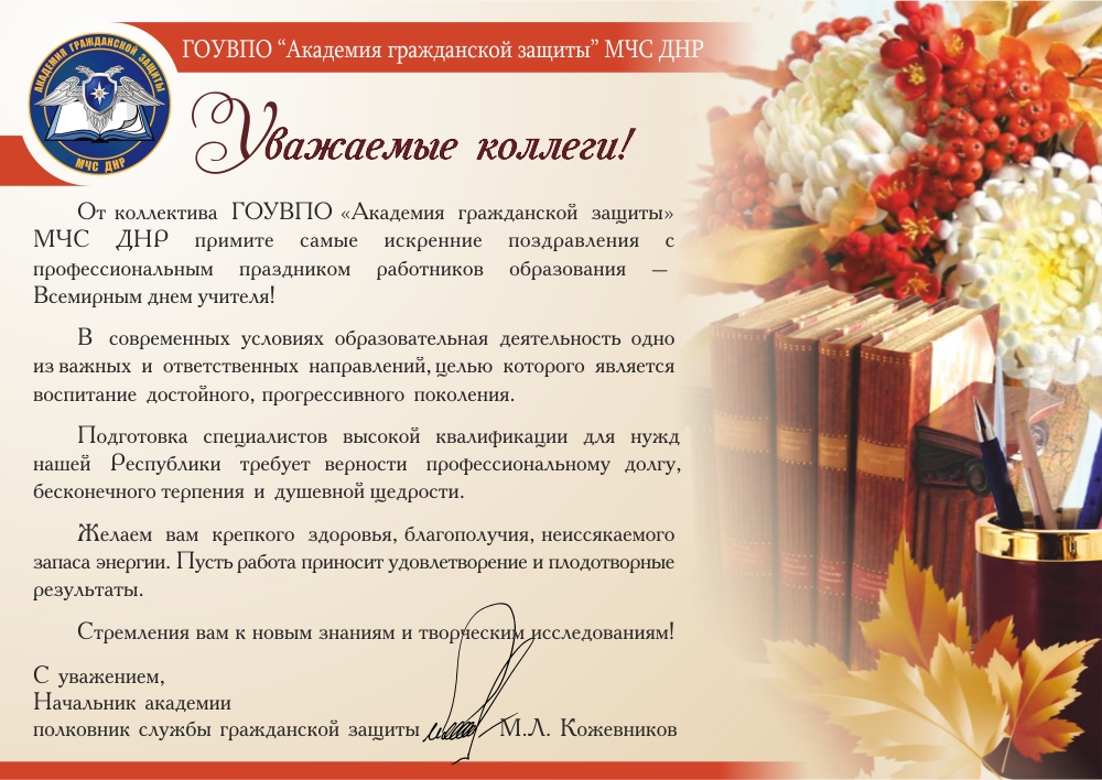 Поздравление начальника ГОУВПО "Академия гражданской защиты" МЧС ДНР полковника службы гражданской защиты Кожевникова Михаила Леонидовича с профессиональным праздником работников образования