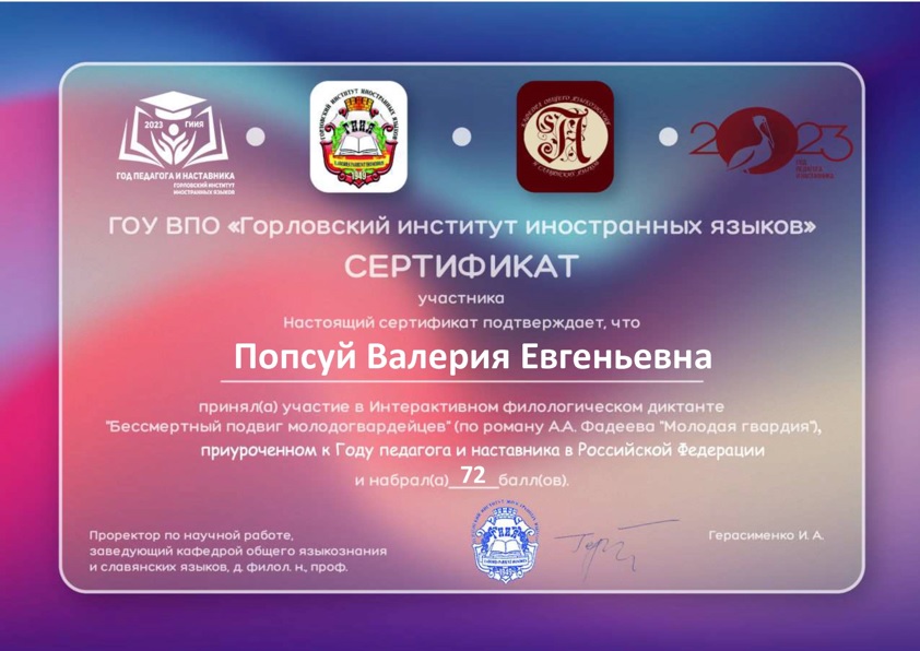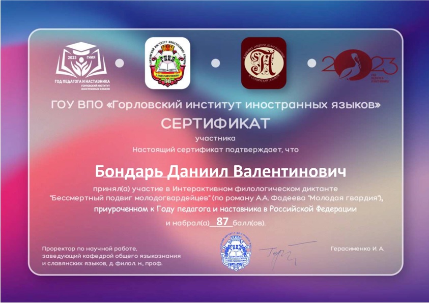 31 марта 2023 г. обучающиеся ГБОУ ВО «АГЗ МЧС ДНР» Бондарь Данил (ПБ-22б) и Попсуй Валерия (ТБ-21а) приняли участие в Интерактивном филологическом диктанте «Бессмертный подвиг молодогвардейцев» (по роману А.А. Фадеева «Молодая гвардия»), организованный ГОУ ВПО «Горловский институт иностранных языков». Мероприятие было приурочено к Году педагога и наставника в Российской Федерации в рамках работы VІII Международного научно-практического очно-заочного семинара «Проблемы изучения и преподавания литературы в школе и вузе: тема детства в литературе и кино». Его цель – привлечение внимания к творчеству А.А. Фадеева и чтению классической литературы. Роман «Молодая гвардия», посвящённый событиям Великой Отечественной войны, не теряет своей актуальности и в наши дни.