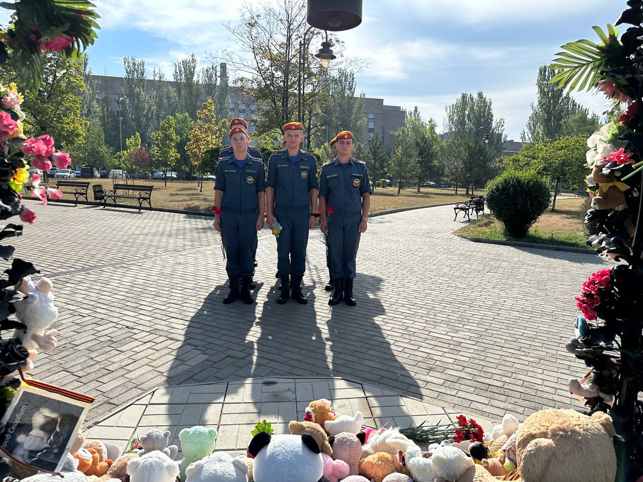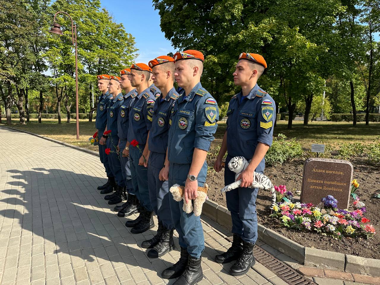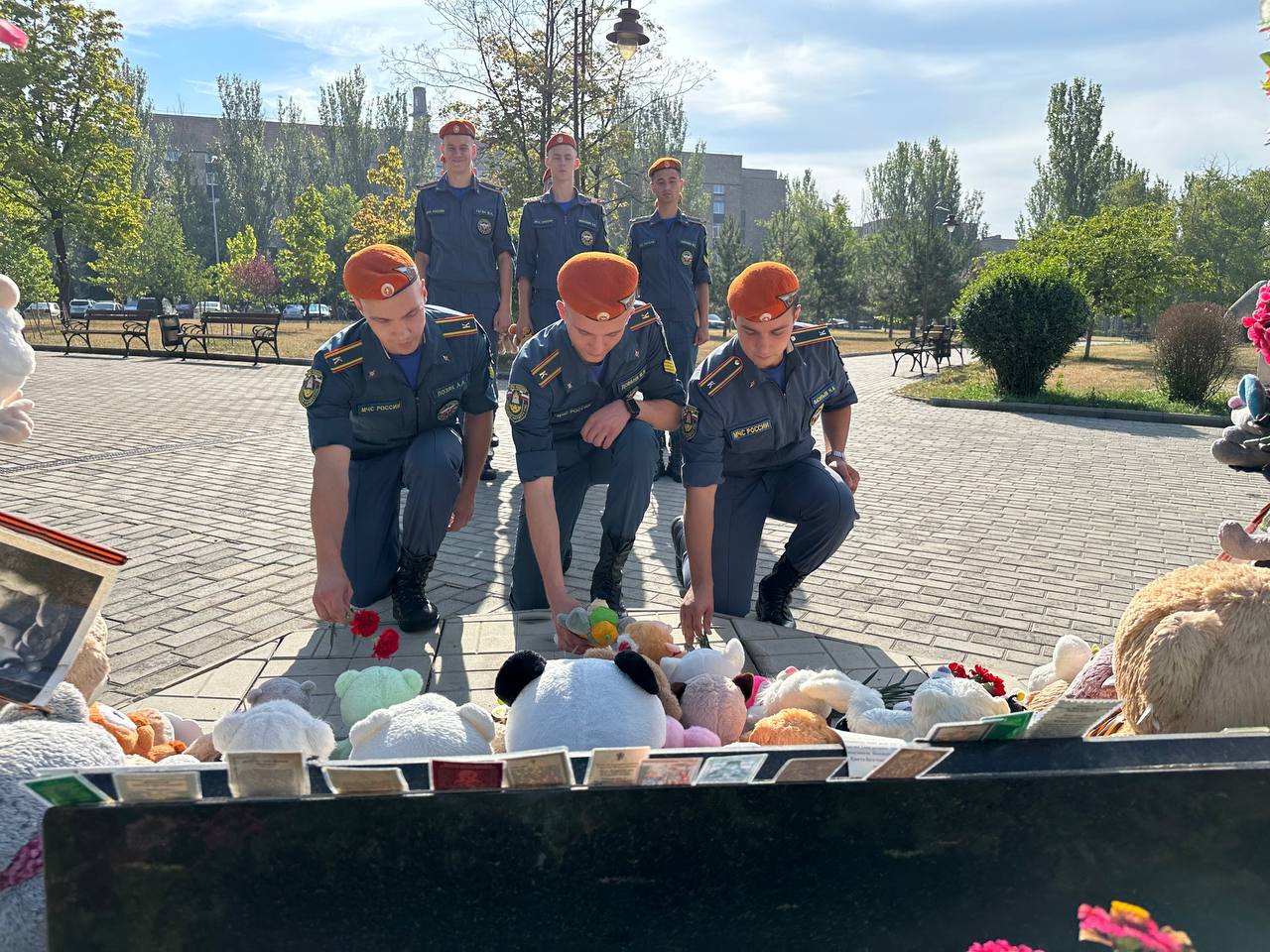 В знак памяти и скорби, курсанты Донецкого института ГПС МЧС России возложили цветы и игрушки к памятнику погибшим детям Донбасса, участники на минуту склонили головы перед светлой памятью тех кто мог жить долго и счастливо, радоваться солнцу, мог сделать этот мир добрее и светлее.