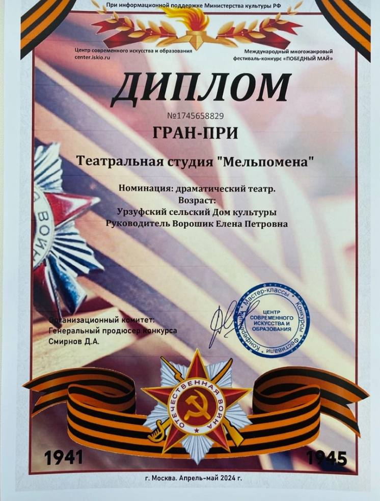 Жюри конкурса высоко оценило творчество участников фестиваля и в номинации: «Драматический театр» коллектив студии «Мельпомена» завоевал Гран-при.