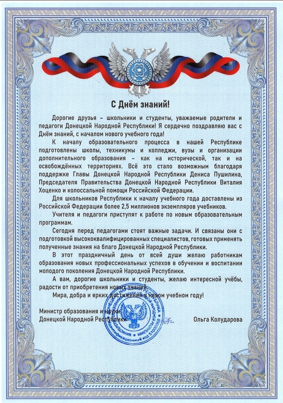 Поздравление Министра образования и науки ДНР Ольги Колударовой C Днём знаний!