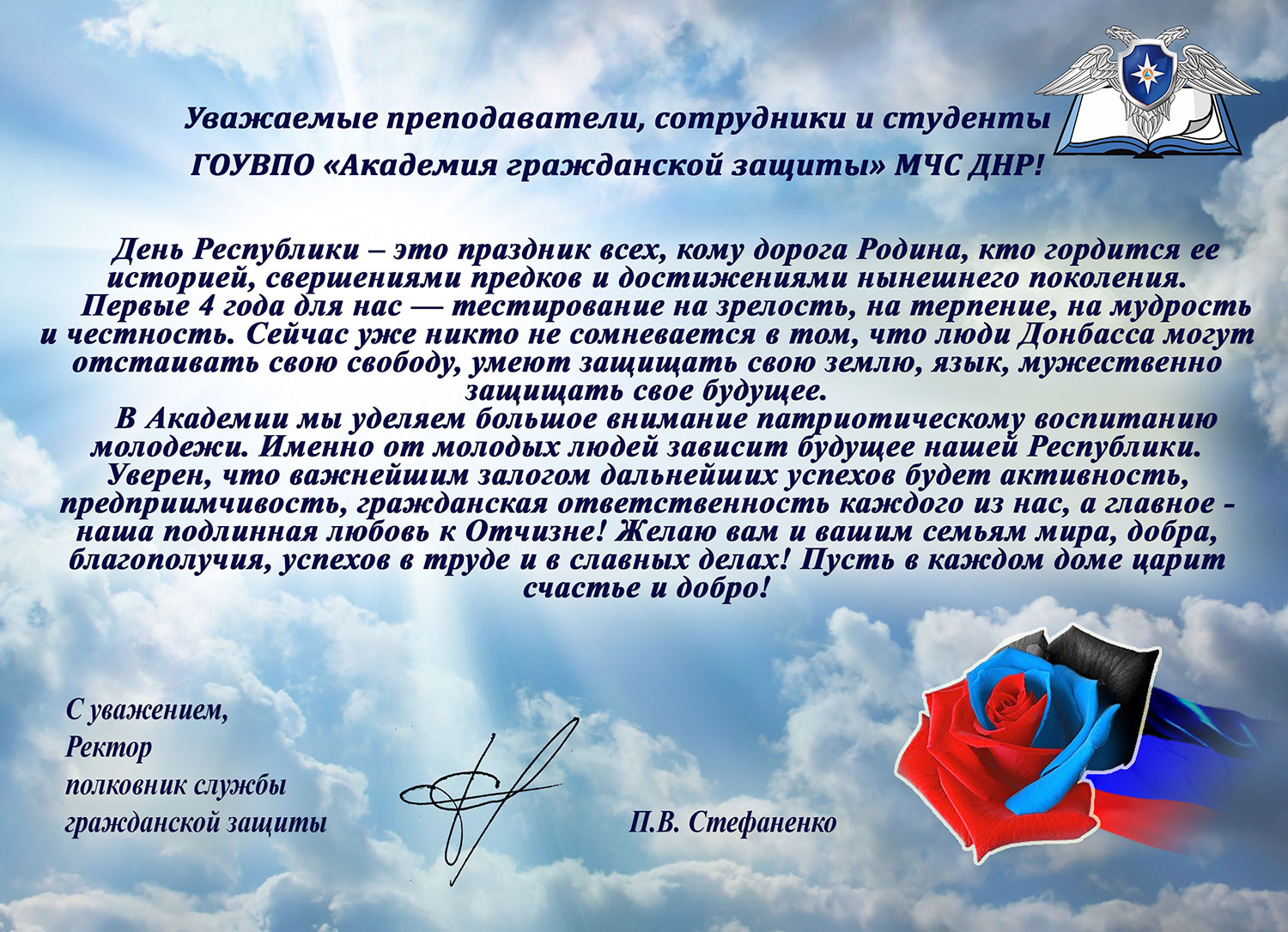 Поздравление ректора ГОУВПО "Академия гражданской защиты" МЧС ДНР полковника службы гражданской защиты Стефаненко Павла Викторовича с Днем Республики