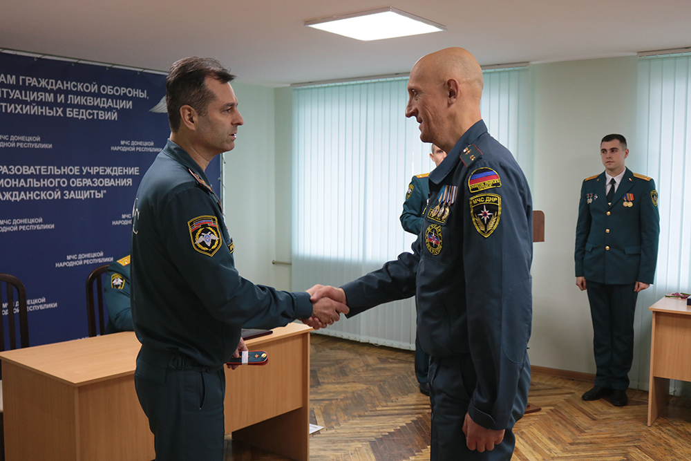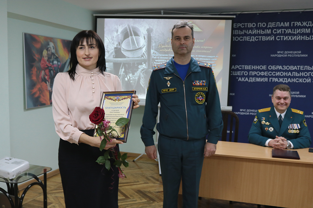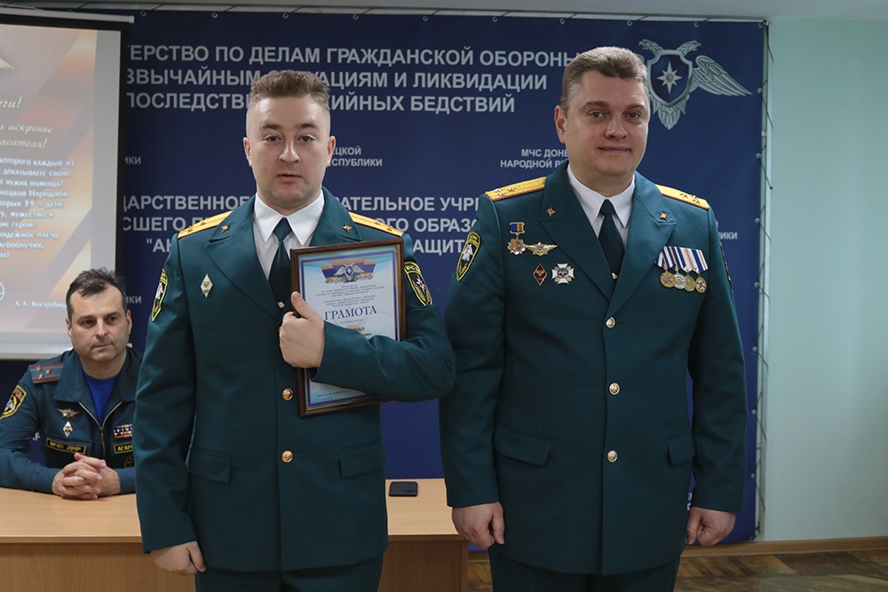 Начальник Академии полковник службы гражданской защиты Кожевников М.Л. поздравил личный состав Академии с Днем спасателя Донецкой Народной Республики, наступающим Новым Годом и Рождеством Христовым, вручил сотрудникам Академии за особые трудовые заслуги, умелое руководство коллективом, высокий профессионализм, самоотдачу в деле обучения и воспитания квалифицированных специалистов свидетельства о занесении на Доску почёта Академии их фотографий и наградил Грамотами Академии.
