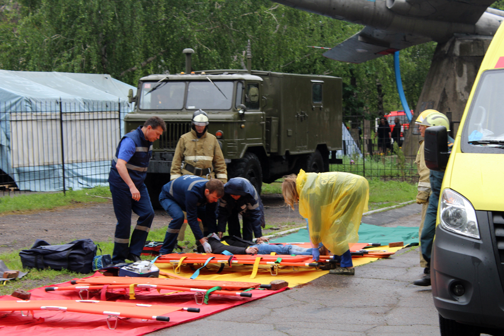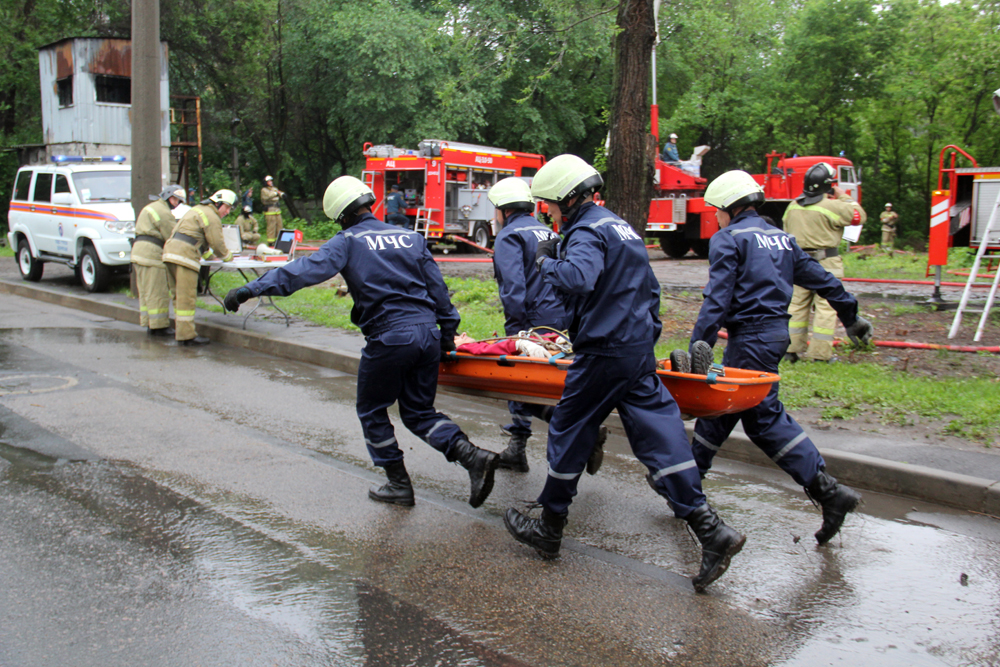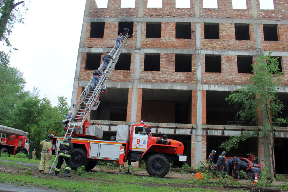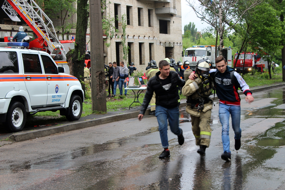 В соответствии с замыслом проведения учения диспетчеру оперативно-диспетчерской службы Государственного пожарно-спасательного отряда г. Донецка от жителей Калининского района начали поступать многочисленные сообщения о том, что вследствие взрыва (предположительно бытового газа) произошло частичное разрушение жилого дома. В повреждённом доме под завалами находятся люди. К месту происшествия незамедлительно были направлены силы и средства МЧС ДНР, в том числе кинологическое отделение для поиска пострадавших и спасательное отделение для выполнения верхолазных спасательных работ.