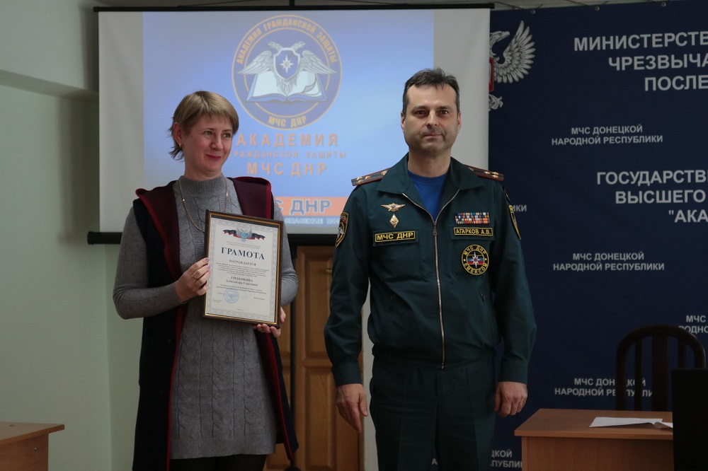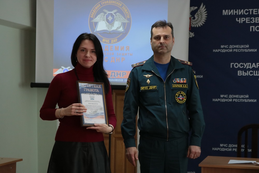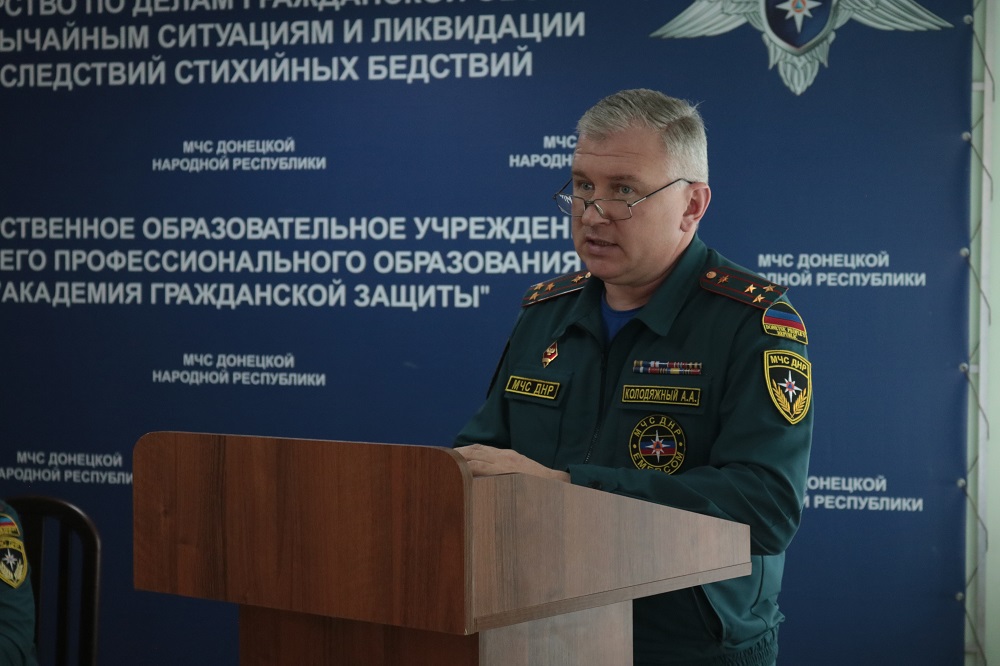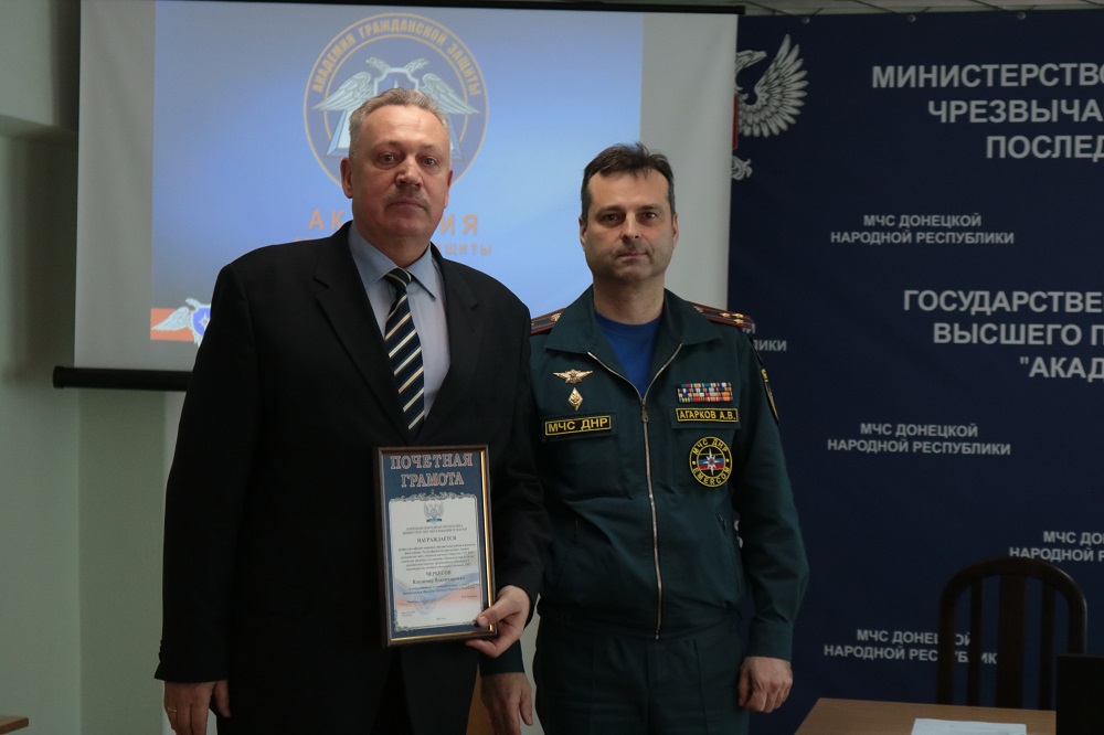 Перед началом подведения итогов к коллективу Академии с приветственным словом обратились заместитель Министра МЧС ДНР полковник службы гражданской защиты Агарков А.В. и начальник Академии полковник службы гражданской защиты Кожевников М.Л.