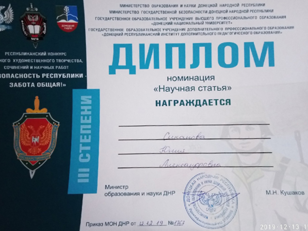 От нашей Академии очное участие в конференции приняла магистрант 1 курса факультета «Техносферной безопасности» Сиканова Юлия, которая выступила с докладом «Проблемы национальной безопасности в ДНР». По итогам работы конференции в номинации «Научная статья» ей был вручен диплом ІІІ степени МОН ДНР и благодарность Министра государственной безопасности ДНР за занятое ІІІ место в номинации «Научная статья» Республиканского конкурса «Безопасность Республики – забота общая!».