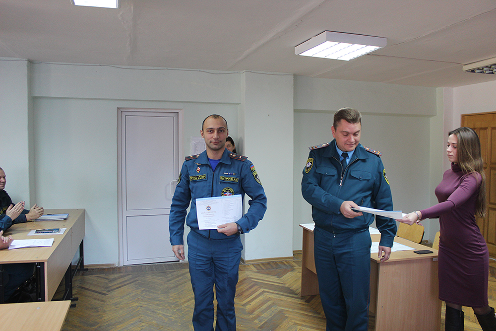 Сегодня, 22 ноября 2019 года, в учебном корпусе ГОУВПО «Академия гражданской защиты» МЧС ДНР состоялось мероприятие по вручению удостоверений о повышении квалификации по дополнительной профессиональной программе повышения квалификации руководящего состава по организации оперативно-служебной деятельности в подразделениях Государственной оперативно-спасательной службы, а также удостоверения о повышении квалификации по дополнительной профессиональной программе повышения квалификации руководителей и специалистов по вопросам гражданской защиты Государственной оперативно-спасательной службы. Всего с 28 октября повышение квалификации в Академии по указанным категориям прошли 19 сотрудников Министерства.