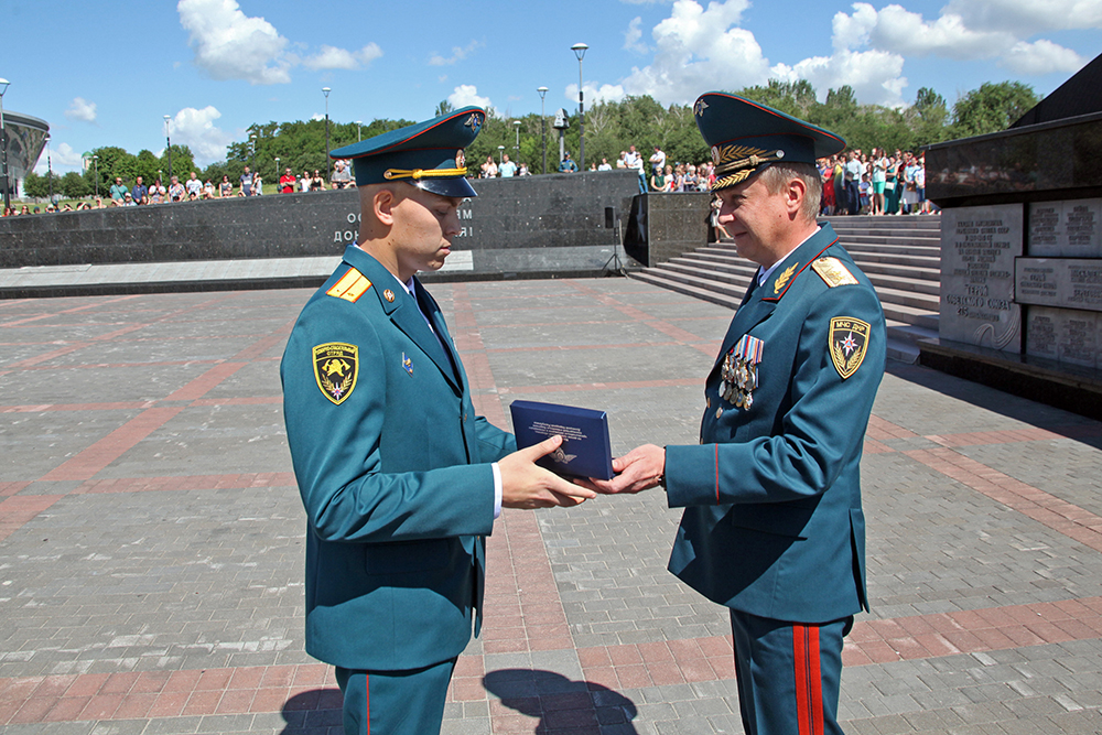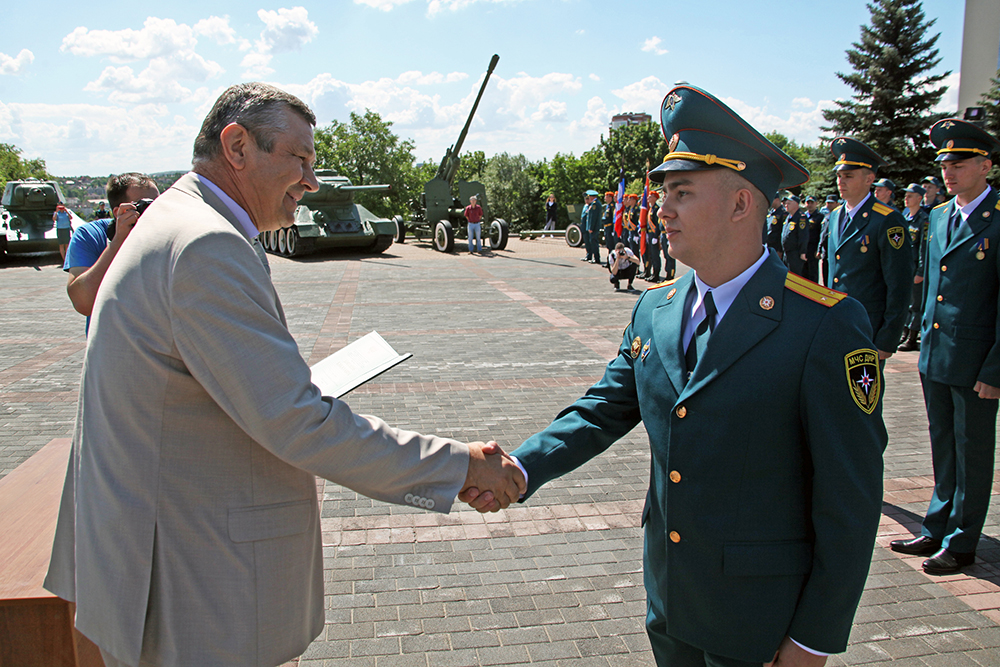 В торжественной обстановке Министр МЧС наградил лейтенантов службы гражданской защиты Кошеля Сергея и Тарасенко Владислава памятными знаками «За высокие достижения в учебе» второй степени. После чего Алексей Александрович обратился к выпускникам с напутственным словом: «Я хочу, чтобы вы гордились своей профессией, гордились высоким званием «Спасатель». Уверен, что вы сможете на самом высоком уровне оказывать помощь людям, попавшим в беду и приумножать славные традиции МЧС! На вашем пути будет много трудностей. Но я уверен, что вы стойко их преодолеете и займете достойное место среди спасателей!»