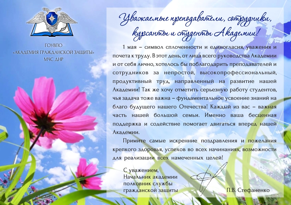 Поздравление начальника ГОУВПО "Академия гражданской защиты" МЧС ДНР полковника службы гражданской защиты профессора Стефаненко Павла Викторовича с праздником 1 Мая