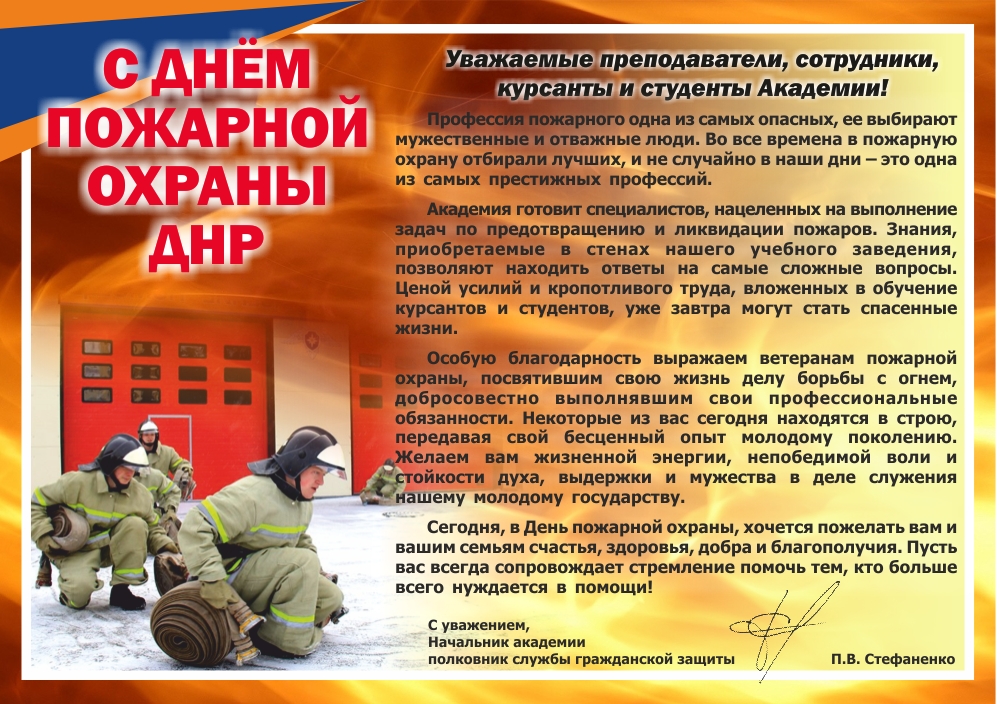 Поздравление начальника ГОУВПО "Академия гражданской защиты" МЧС ДНР полковника службы гражданской защиты профессора Стефаненко Павла Викторовича с Днем пожарной охраны