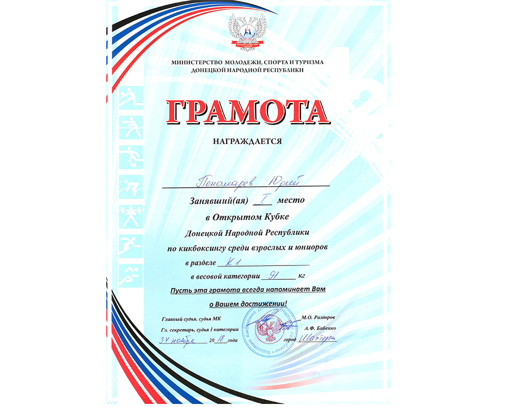 Поздравление победителя спортивного соревнования «Открытый Кубок Донецкой Народной Республики по кикбоксингу»