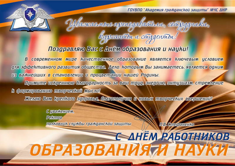 Поздравление ректора ГОУВПО "Академия гражданской защиты" МЧС ДНР полковника службы гражданской защиты Стефаненко Павла Викторовича с Днём образования и науки