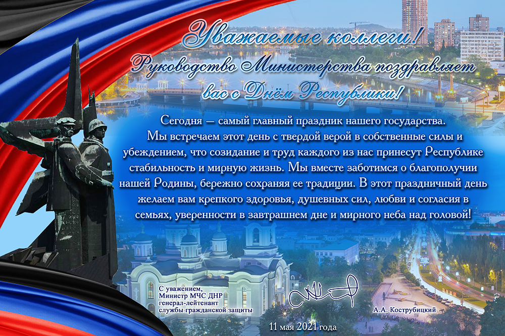 Поздравление Министра МЧС ДНР Алексея Александровича Кострубицкого с Днём Республики