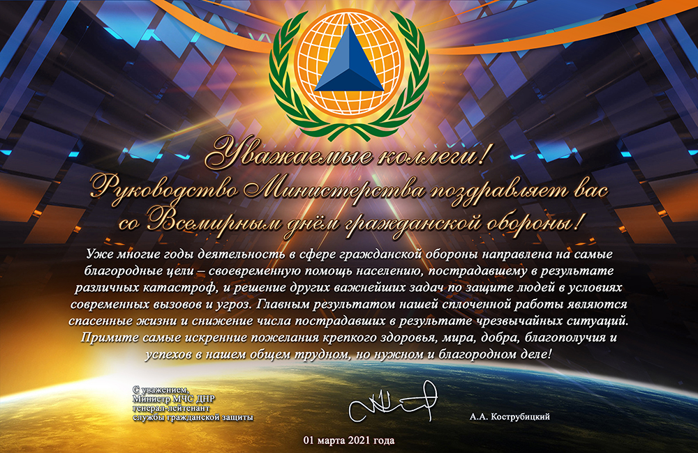 Поздравление Министра МЧС ДНР Алексея Александровича Кострубицкого со Всемирным днём гражданской обороны