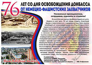 Поздравление начальника ГОУВПО "Академия гражданской защиты" МЧС ДНР полковника службы гражданской защиты Стефаненко Павла Викторовича с 76-й годовщиной со Дня освобождения Донбасса