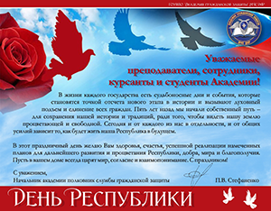 Поздравление начальника ГОУВПО "Академия гражданской защиты" МЧС ДНР полковника службы гражданской защиты профессора Стефаненко Павла Викторовича с Днем Донецкой Народной Республики