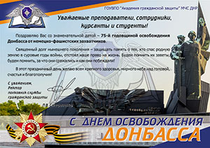 Поздравление ректора ГОУВПО "Академия гражданской защиты" МЧС ДНР полковника службы гражданской защиты Стефаненко Павла Викторовича с 75-й годовщиной со Дня освобождения Донбасса от немецко-фашистских