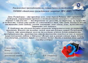 Поздравление ректора ГОУВПО "Академия гражданской защиты" МЧС ДНР полковника службы гражданской защиты Стефаненко Павла Викторовича с Днем Республики