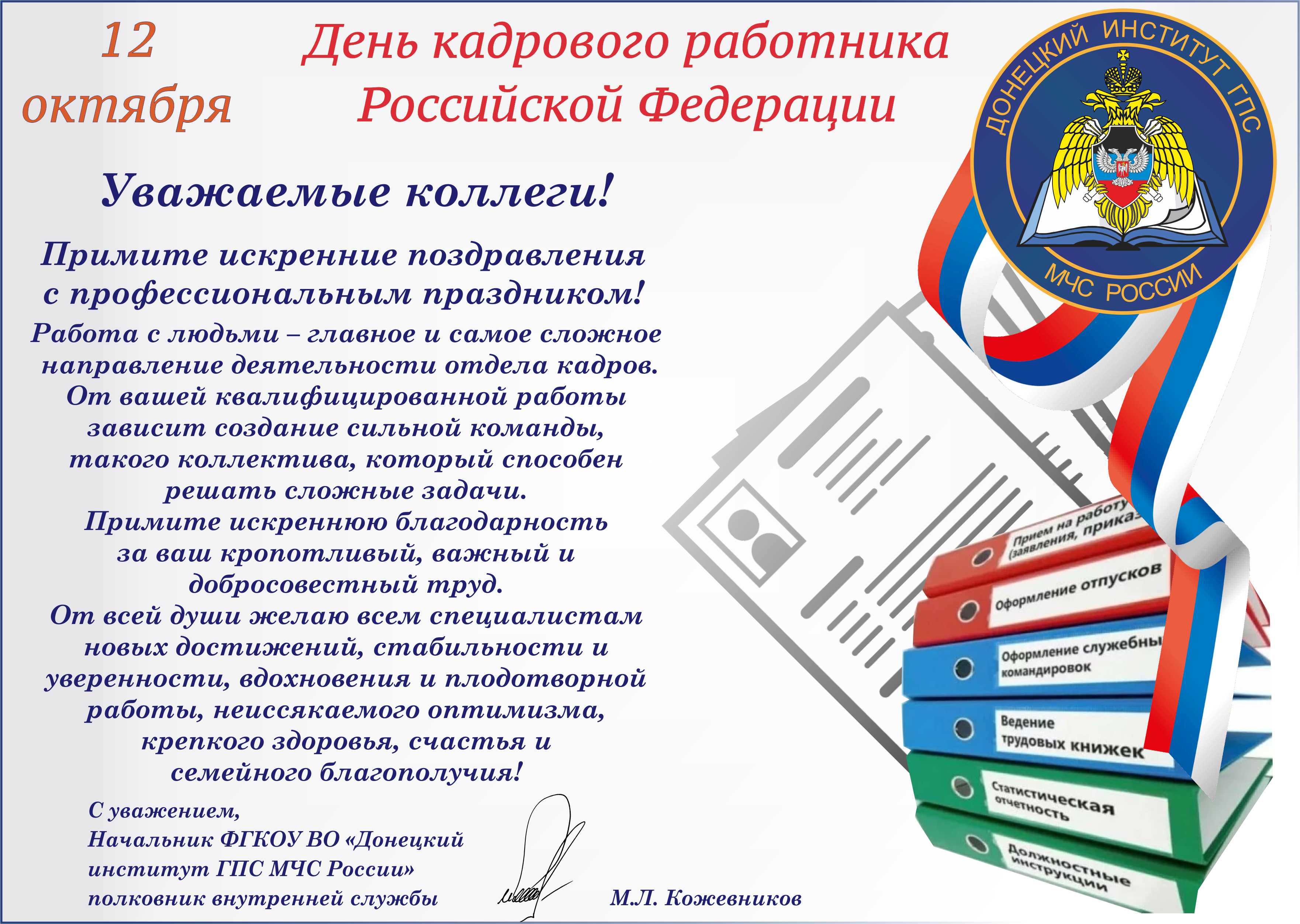 Поздравление начальника Донецкого института ГПС МЧС России полковника внутренней службы Кожевникова М.Л. с Днём кадрового работника Российской Федерации