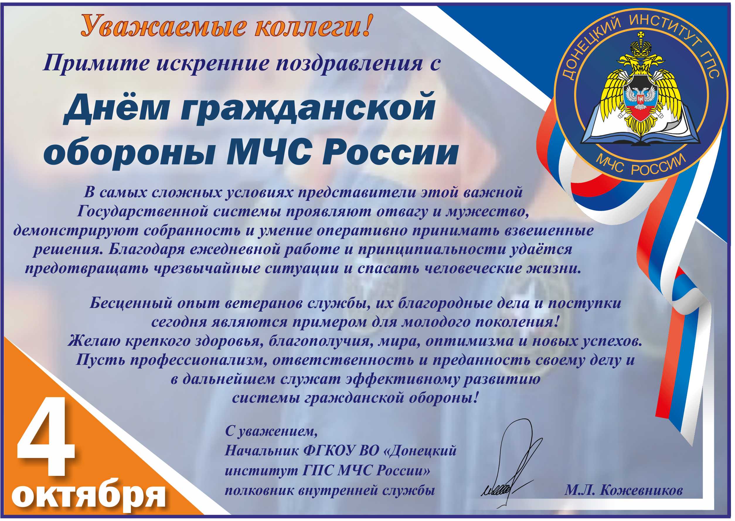 Поздравление начальника Донецкого института ГПС МЧС России полковника внутренней службы Кожевникова М.Л. с Днём гражданской обороны МЧС России