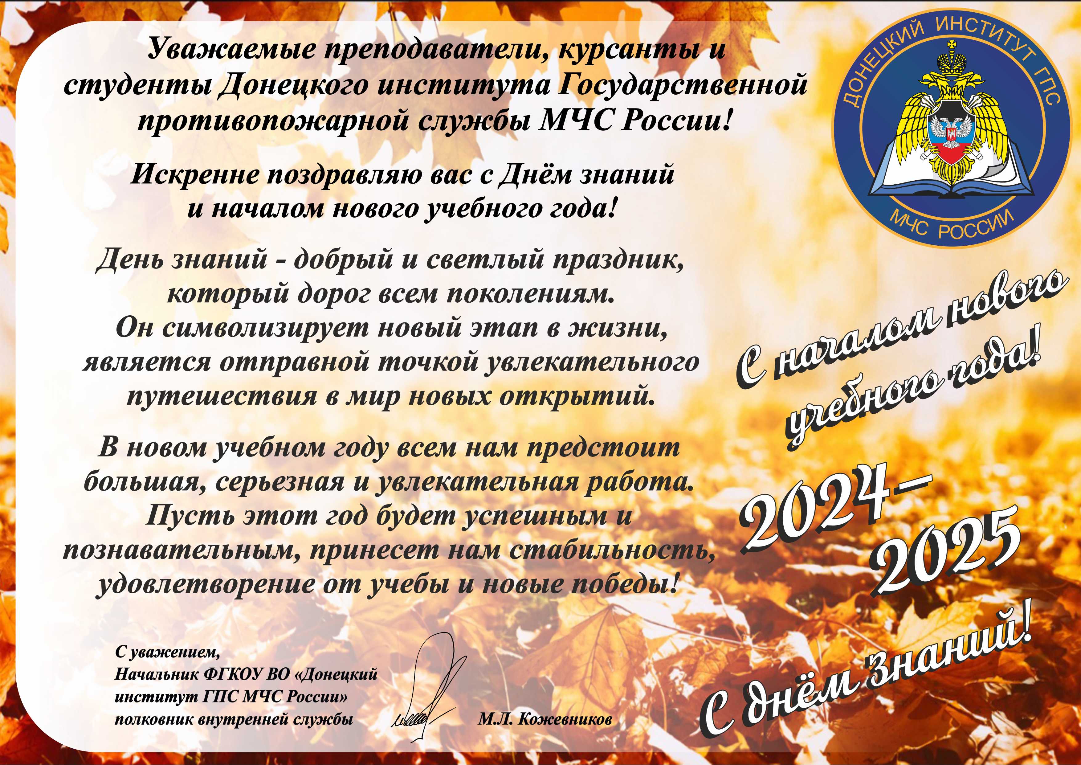 Поздравление начальника Донецкого института ГПС МЧС России полковника внутренней службы Кожевникова М.Л. с Днём знаний и началом нового учебного года