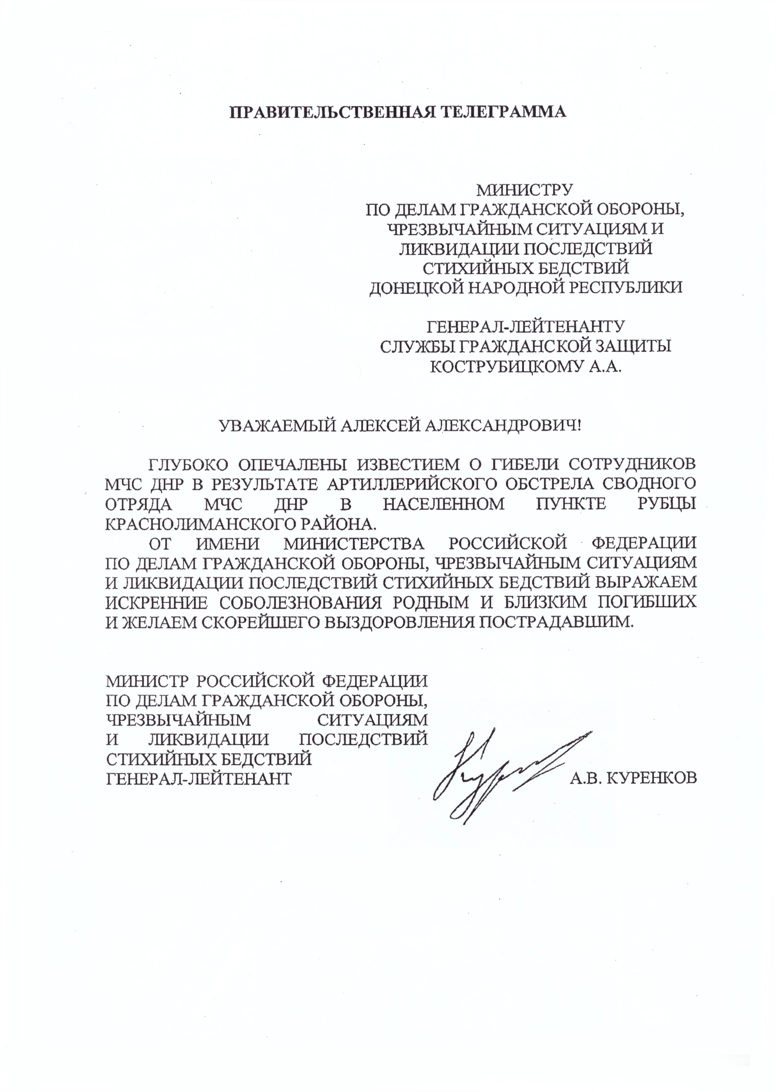 Министр МЧС России Александр Куренков выразил соболезнования в связи с гибелью сотрудников МЧС ДНР
