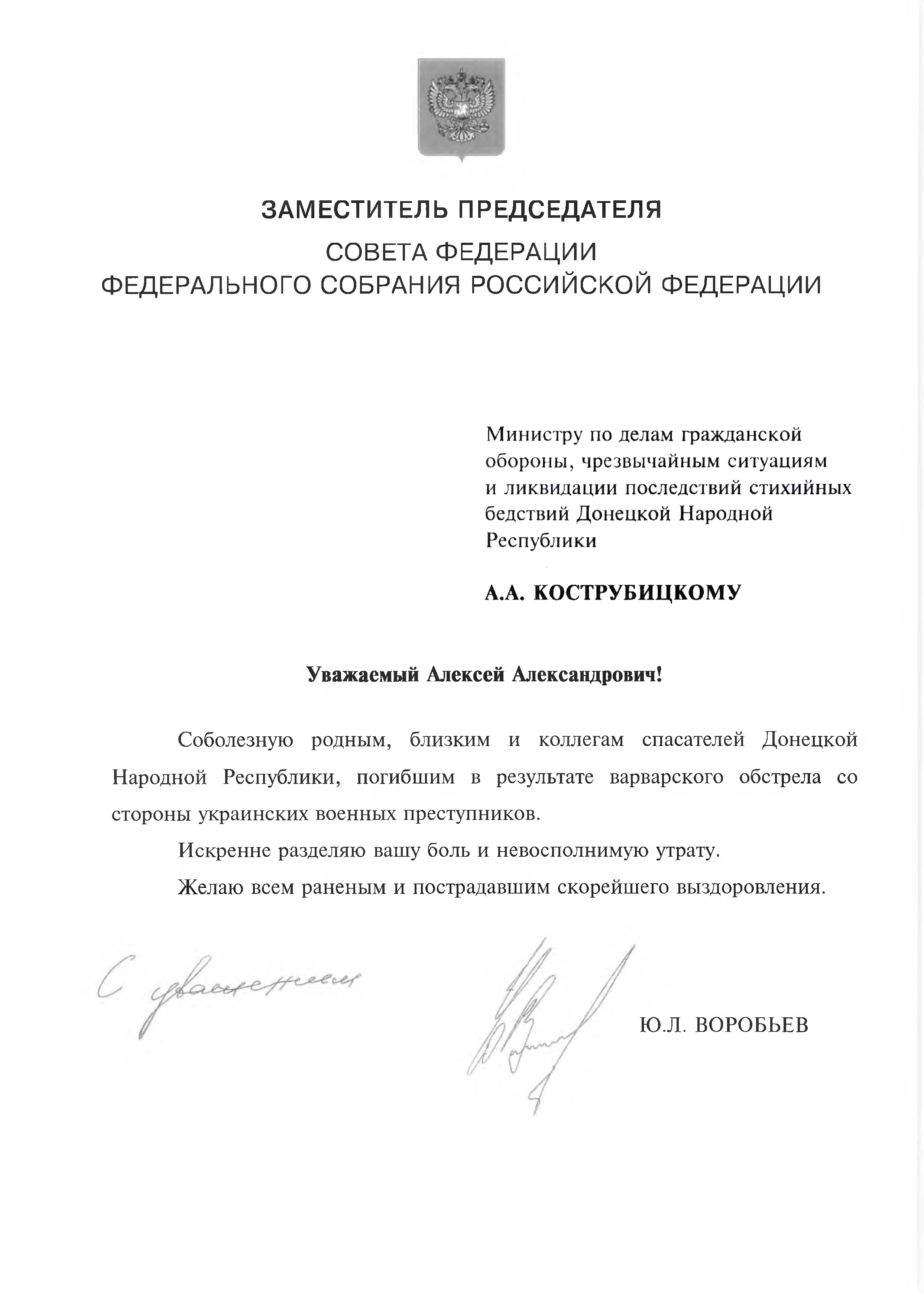 Заместитель Председателя Совета Федерации Федерального Собрания Российской Федерации Юрий Леонидович Воробьев выразил соболезнования в связи с гибелью сотрудников МЧС ДНР