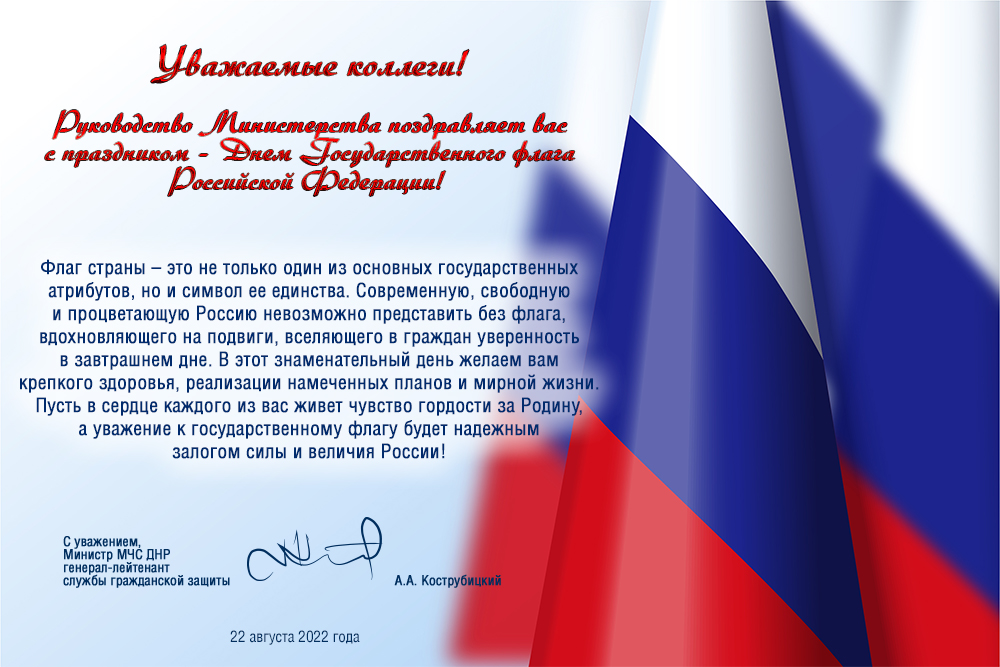 Поздравление Министра МЧС ДНР генерал-лейтенанта службы гражданской защиты Кострубицкого Алексея Александровича с Днём Государственного флага Российской Федерации