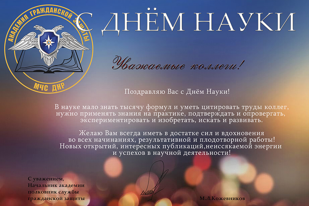 Поздравление начальника ГОУВПО "Академия гражданской защиты" МЧС ДНР полковника службы гражданской защиты Кожевникова Михаила Леонидовича с Днем науки