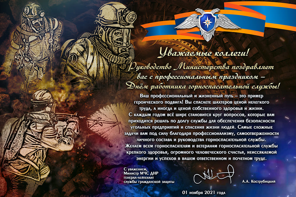 Поздравление Министра МЧС ДНР Алексея Александровича Кострубицкого с Днем работника горноспасательной службы