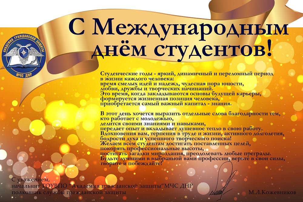 Поздравление начальника ГОУВПО "Академия гражданской защиты" МЧС ДНР полковника службы гражданской защиты Кожевникова Михаила Леонидовича с Международным днем студентов.